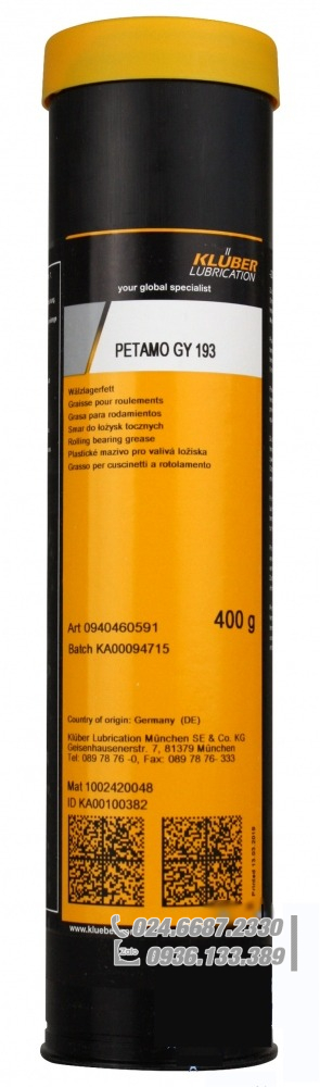 - PETAMO GY 193 là mỡ bôi trơn nhiệt độ cao tổng hợp dựa trên dầu este chất lượng cao, chất làm đặc polyurea và các chất phụ gia đặc biệt. Mỡ nổi bật với khả năng chống nước và chống ăn mòn tuyệt vời.
