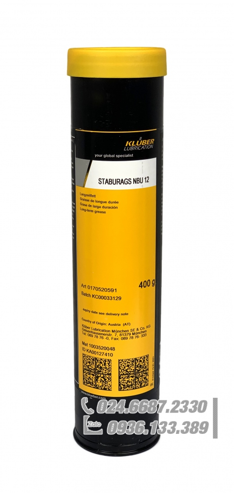 - STABURAGS NBU 12 là mỡ bôi trơn gốc dầu khoáng và xà phòng phức hợp bari. Sản phẩm này chịu được áp suất bề mặt riêng rất cao, do đó đảm bảo khả năng chống mài mòn tốt. Ngoài ra, nó có khả năng chống ăn mòn, nước và nhiều dung dịch kiềm và axit loãng