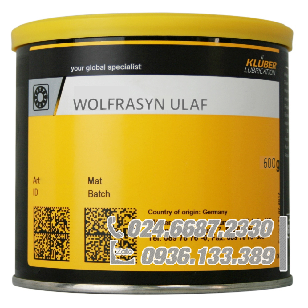 • WOLFRASYN ULAF là chất bôi trơn nhiệt độ cao có chứa than chì để bôi trơn màng mỏng của ổ lăn và ổ trượt. Nó có thành phần hóa học là dầu polyalkylene glycol và chất bôi trơn rắn vô cơ (than chì).
