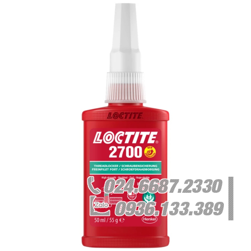 LOCTITE® 2700 là chất khóa ren cường độ cao cho hiệu quả tối đa trong việc cố định và bịt kín bu lông, đai ốc và đinh tán để tránh nới lỏng do rung động. Sản phẩm dùng để khóa vĩnh viễn các bộ phận không được lỏng lẻo. Nó hoạt động trên tất cả các kim loại, bao gồm cả chất nền thụ động. Ô nhiễm nhẹ được chấp nhận. LOCTITE 2700 không mang biểu tượng nguy hiểm, cụm từ rủi ro hoặc an toàn và không chứa bất kỳ chất gây ung thư, chất gây đột biến hoặc chất độc sinh sản nào được công bố.