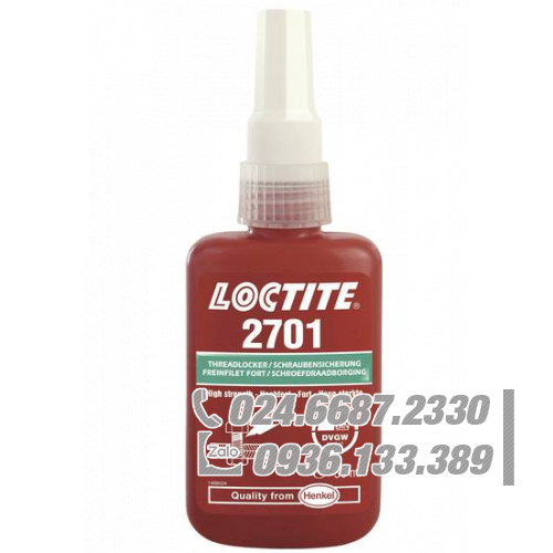 LOCTITE® 2701 là chất kết dính khóa ren màu xanh lục, có độ nhớt thấp, gốc methacrylate với độ bền cao, đặc biệt cho các bề mặt mạ crom. Thời gian cố định thép là 10 phút, đồng thau 4 phút và thép không gỉ 25 phút. Chịu được ô nhiễm nhẹ của dầu công nghiệp. Thích hợp cho tất cả các ốc vít kim loại. Phát huỳnh quang dưới tia UV.